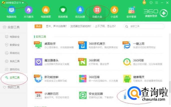如图所示,唤出"360安全卫士"程序窗口。点击工具栏"功能大全"标签,显示360安全卫士全部工具。