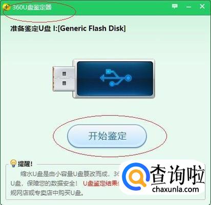 如图所示,弹出"360U盘鉴定器"对话框。点击"开始鉴定"按钮,准备鉴定内存卡I:[Generic Flash Disk]。
