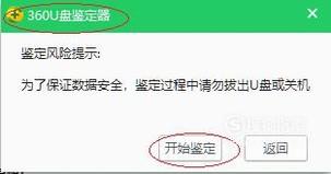 弹出"360U盘鉴定器"信息框,如图所示。显示鉴定风险提示,点击"开始鉴定"按钮。