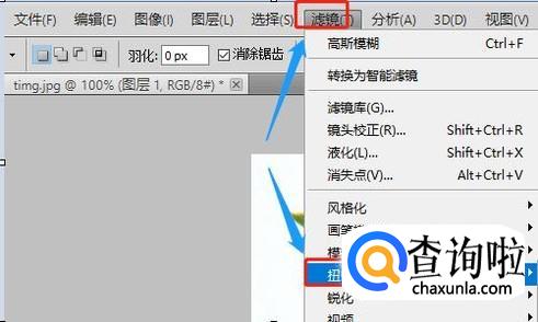 选中新图层,然后在工具栏点击"滤镜"-"扭曲",在扭曲对应的右侧选框里点击"球面化",如图所示