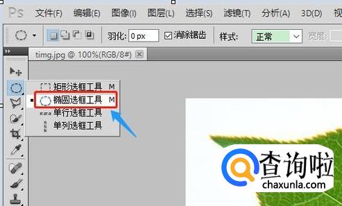 接着我们在左侧的工具里找到"椭圆选框工具",然后在刚才的叶子素材任意位置画一个椭圆出来,如下图;