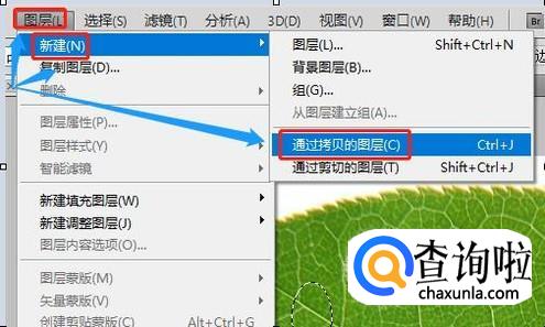画好以后,在最上方的工具栏依次点击"图层"-"新建"-"通过拷贝的图层",然后右侧的图层处就会增加新的一个图层出来,如图二所示;