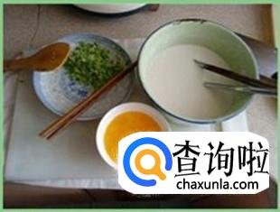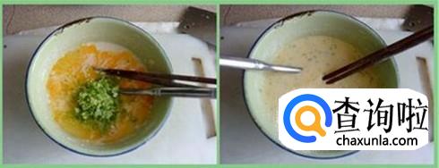 将两个或三个鸡蛋打开放入一个碗中,用筷子搅拌使其分散开;葱花及姜切碎;面粉先用水混合均匀使其成为泥状