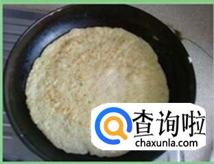 在平底锅中放入适量的植物油,待其8分热时倒入适量的面粉,用铲子使其覆盖在平底锅上,呈圆形