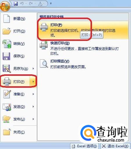 首先,我们打开excel文件,如图所示,点击左上角“office 按钮”,下拉菜单中选择“打印”。
