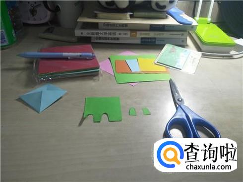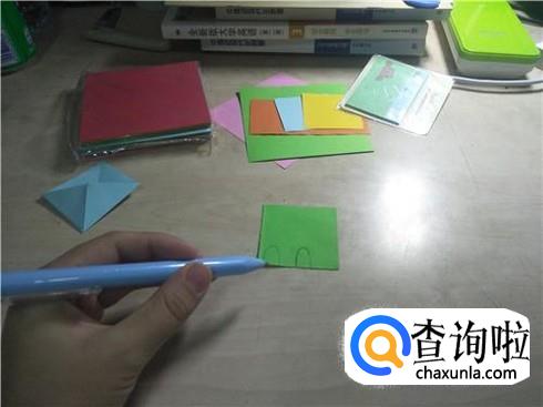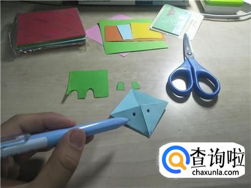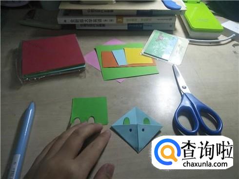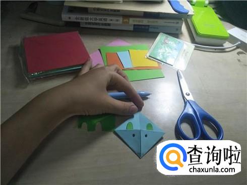 接着再拿出另外一种颜色的正方形纸片在上面画两个小耳朵的图形,再用剪刀将它们剪切下来。