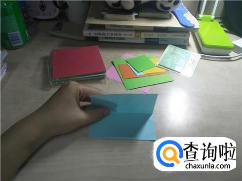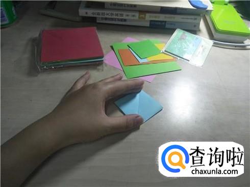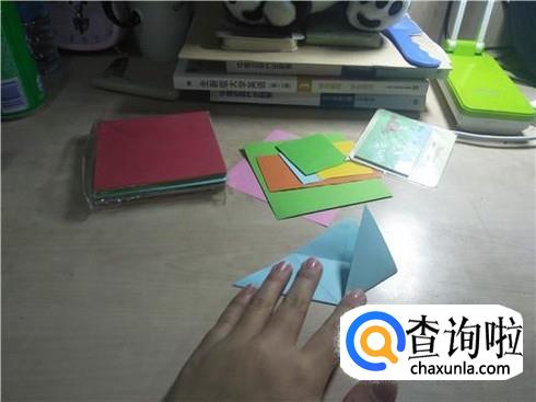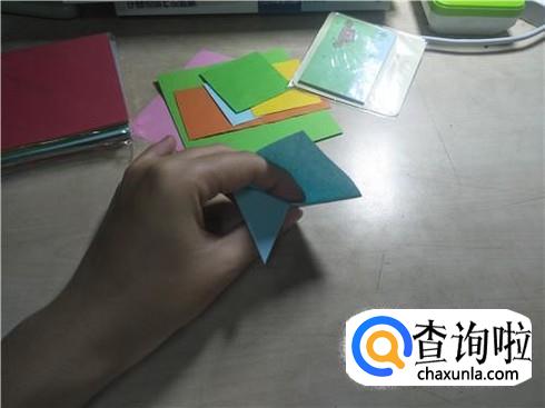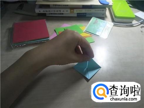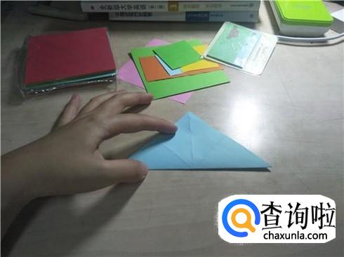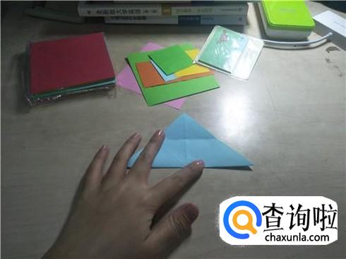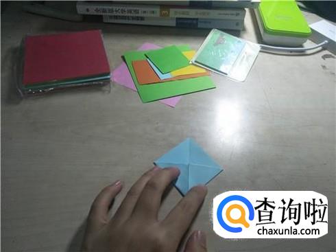 然后再沿着它的对角线的那条折痕进行对折,对着完成之后,将这个三角形图形的顶端部分向下进行折叠,使顶端与它的底部相重合。