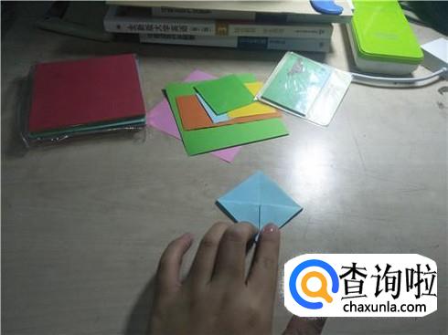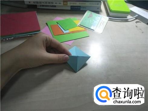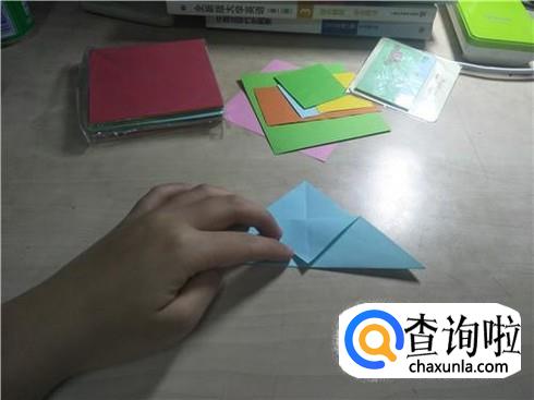 折叠完成之后,再将这个图形的上边部分的两个小的三角形沿着中间的那条轴线进行折叠式,顶端与底端相重合。