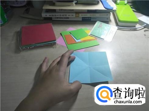 首先将一张正方形纸片沿着它的中轴线进行两次对折,然后再沿着它的对角线再进行两次对折,对折完之后再将它展开,会出现一张带有多条折痕的正方形纸片。