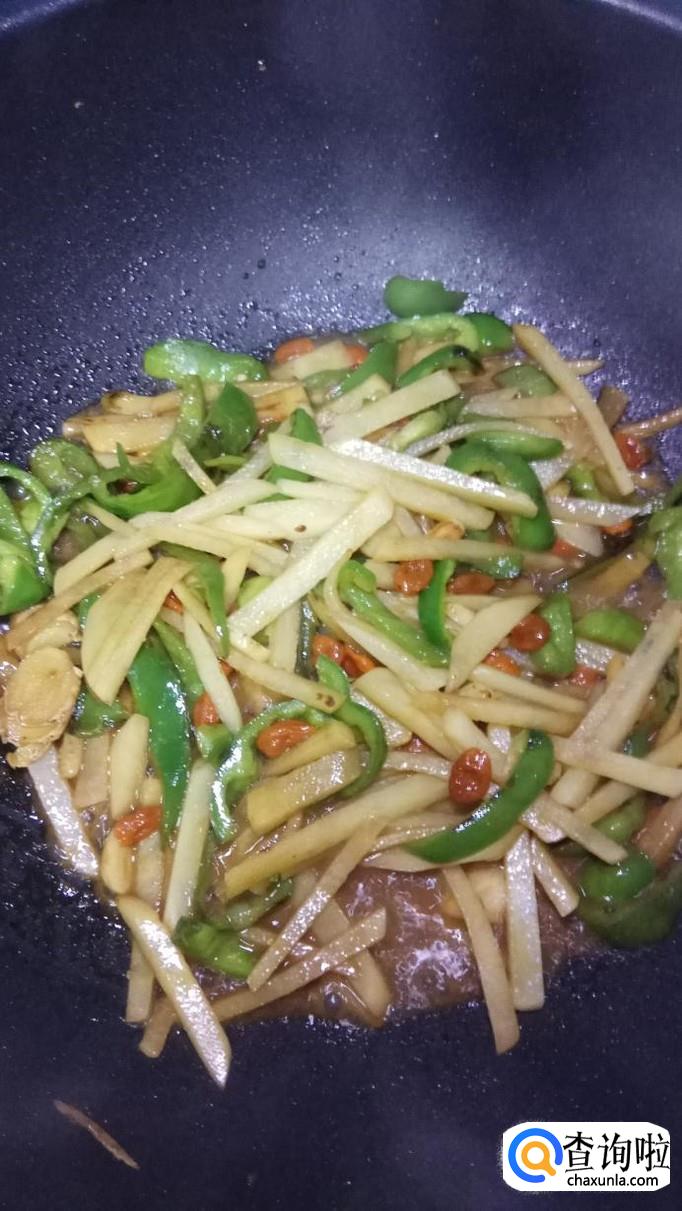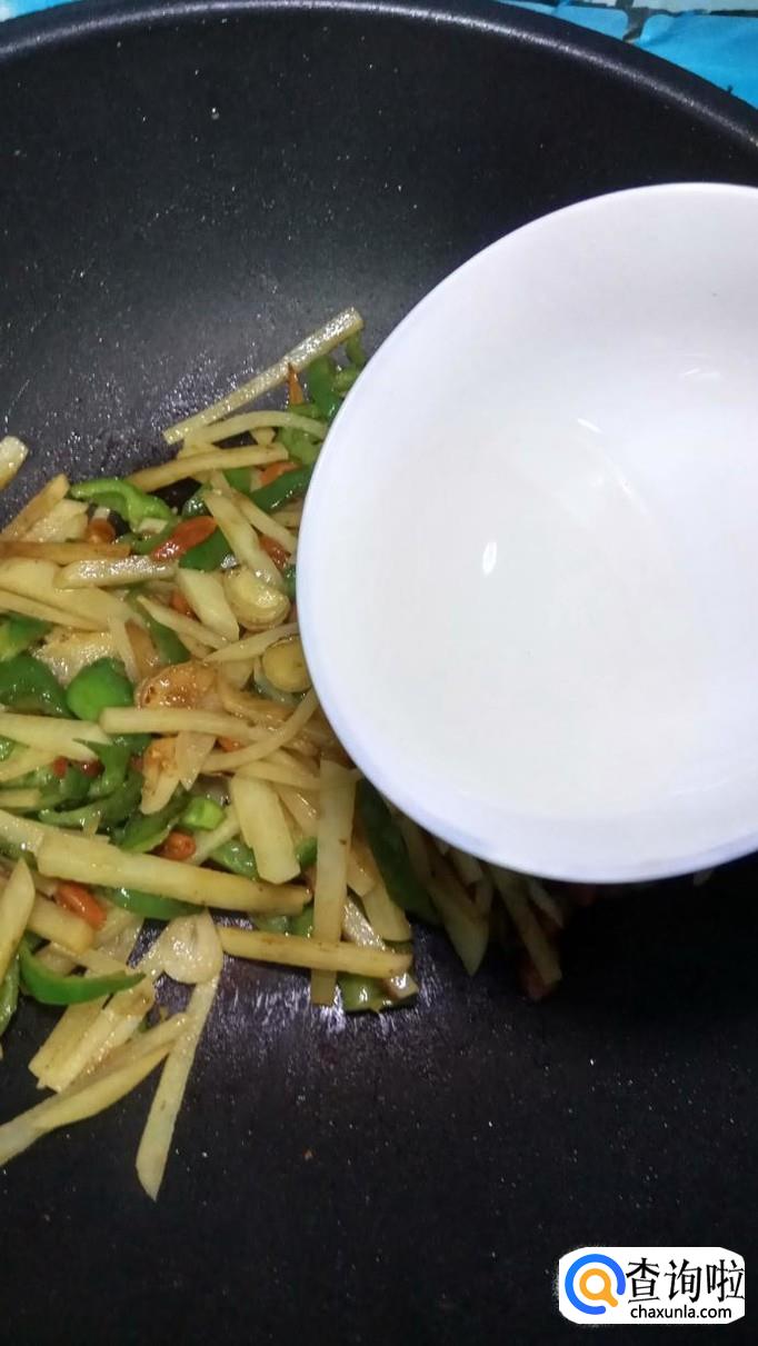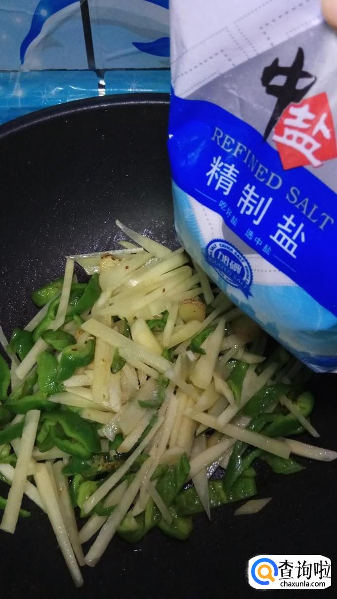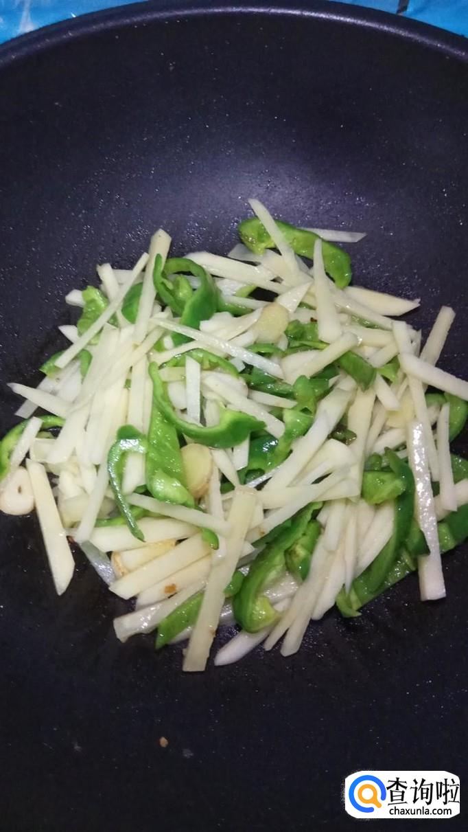 将土豆丝倒入锅中,与青椒一起翻炒均匀,先放青椒的话,味道更香。