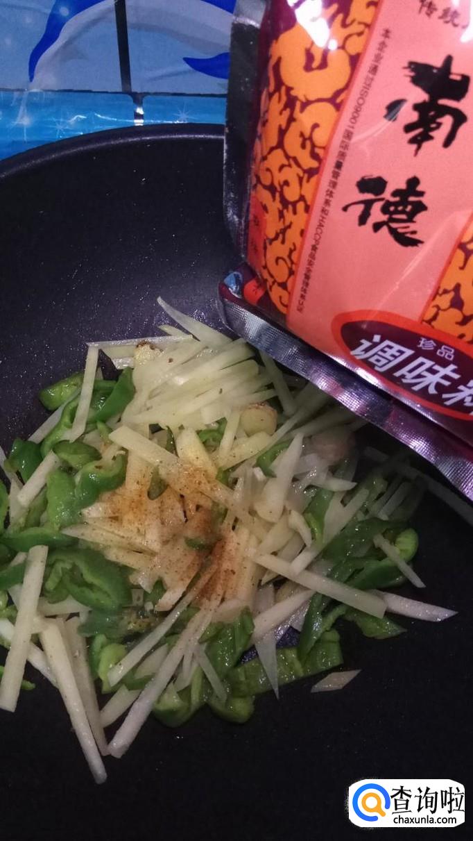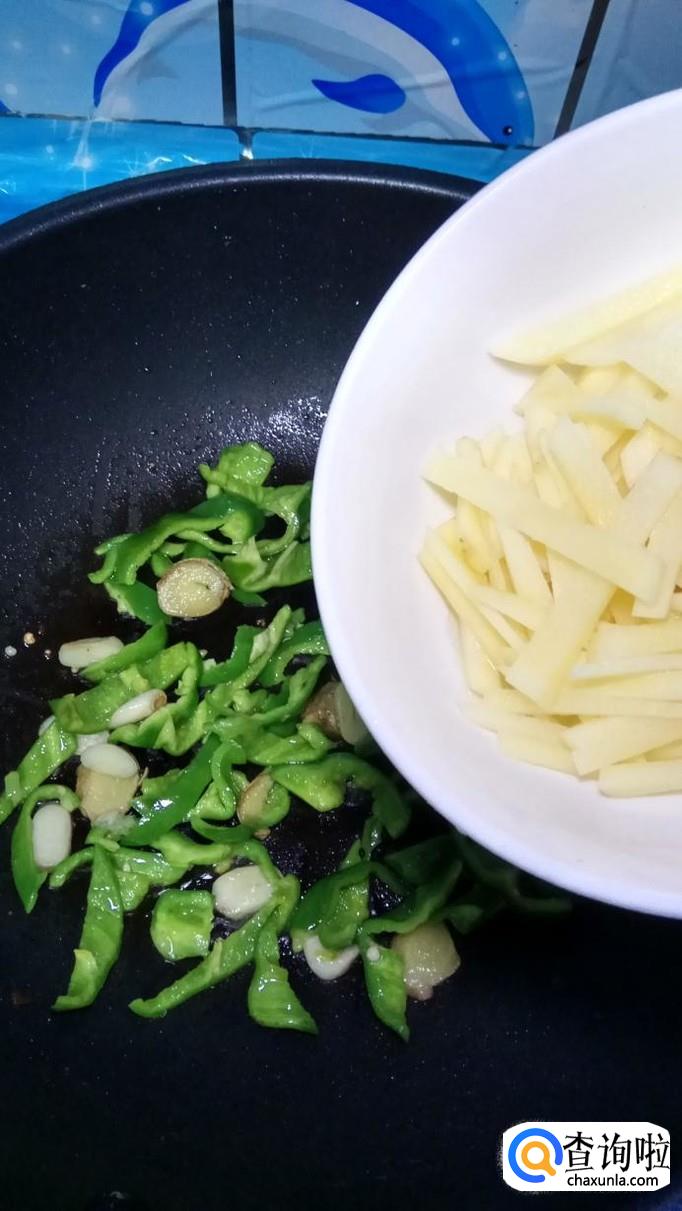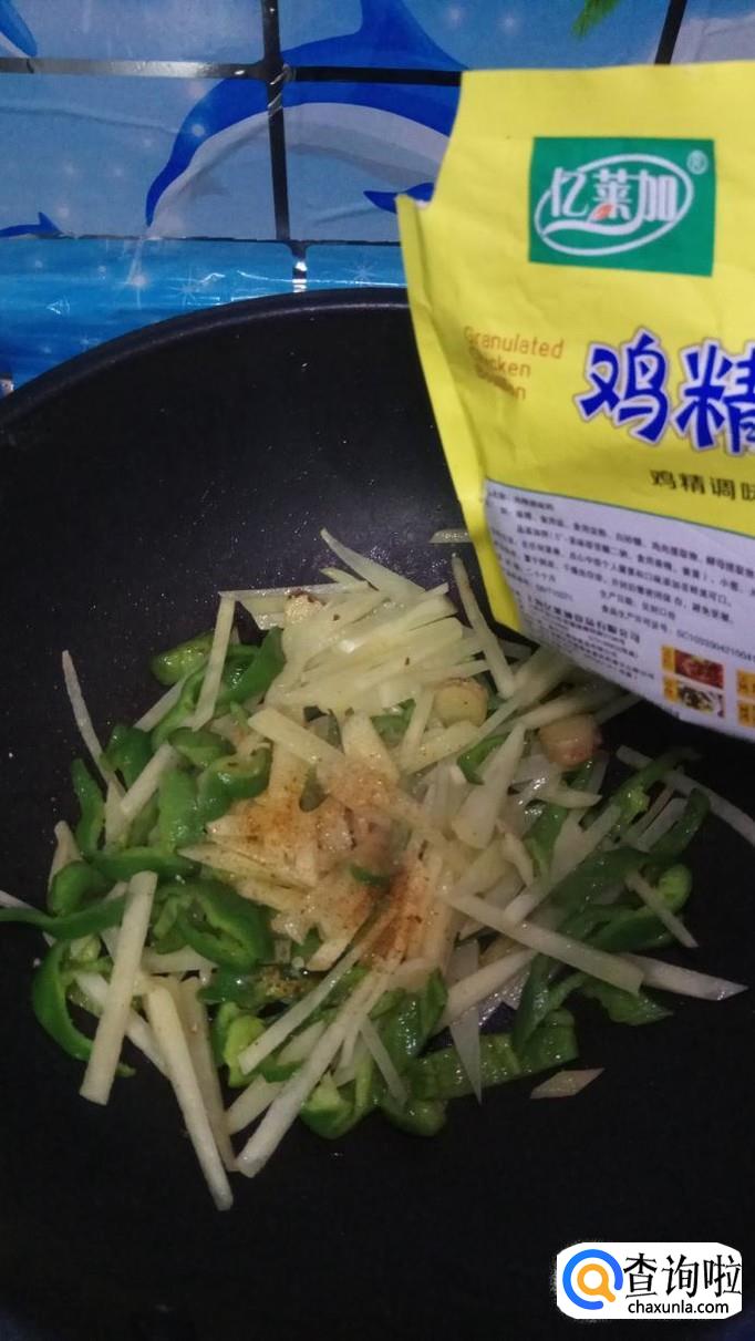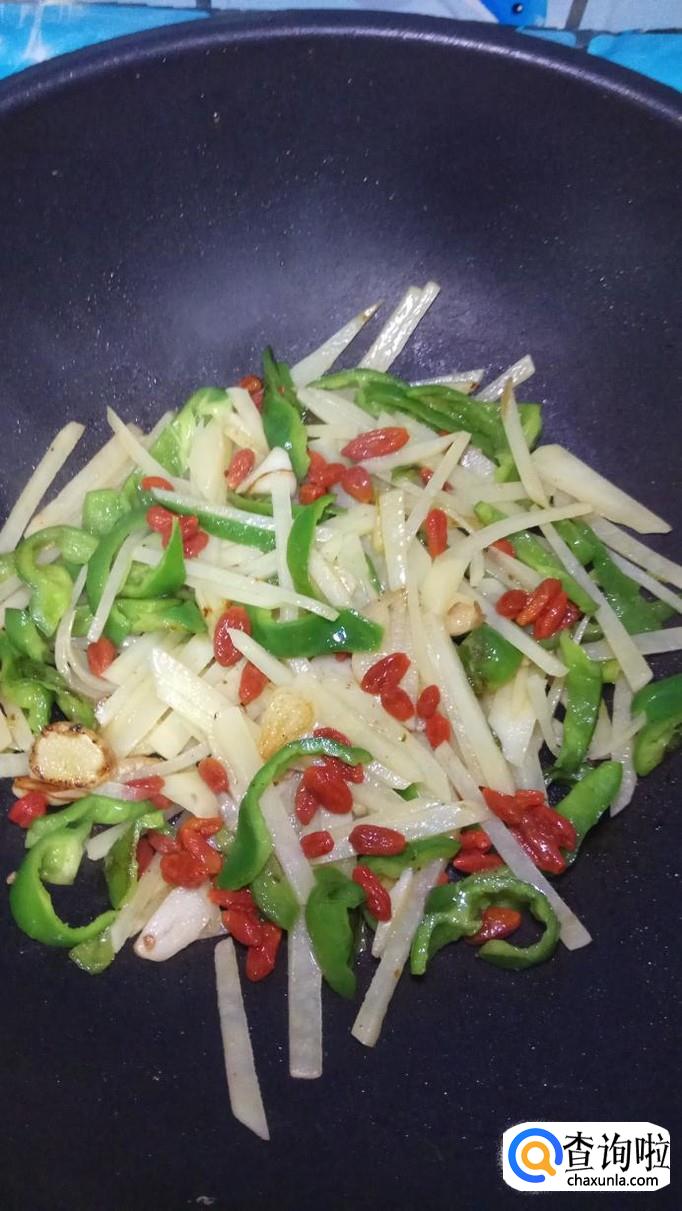 将土豆丝倒入锅中,与青椒一起翻炒均匀,先放青椒的话,味道更香。