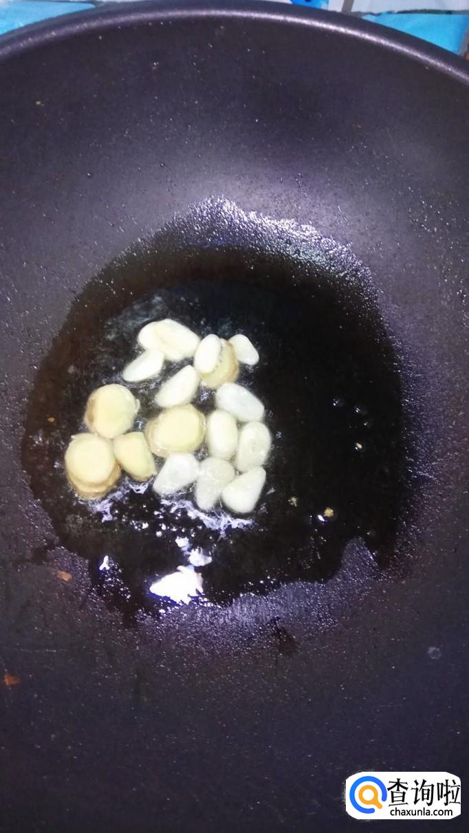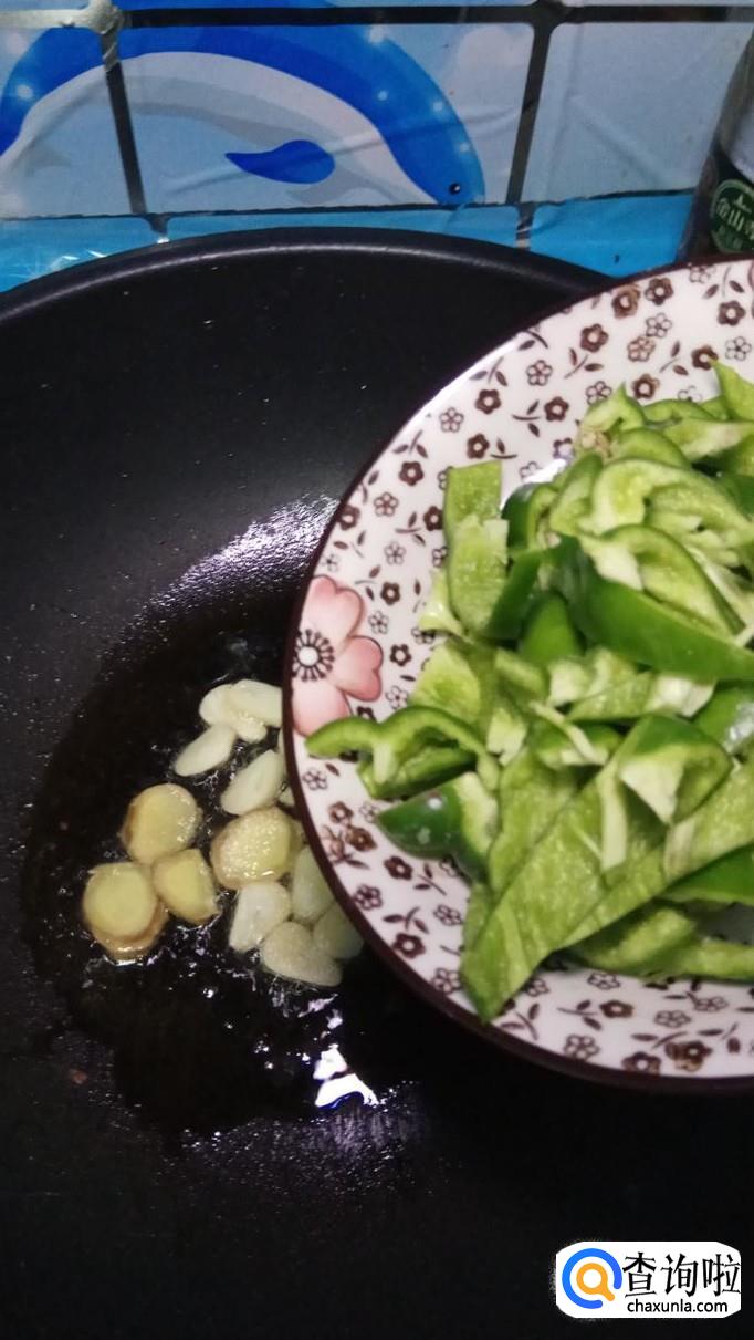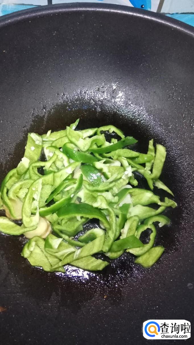 炒锅中放入适量油,油热后,放入蒜片爆香,然后将准备好的青椒倒入锅中,和蒜片一起翻炒。