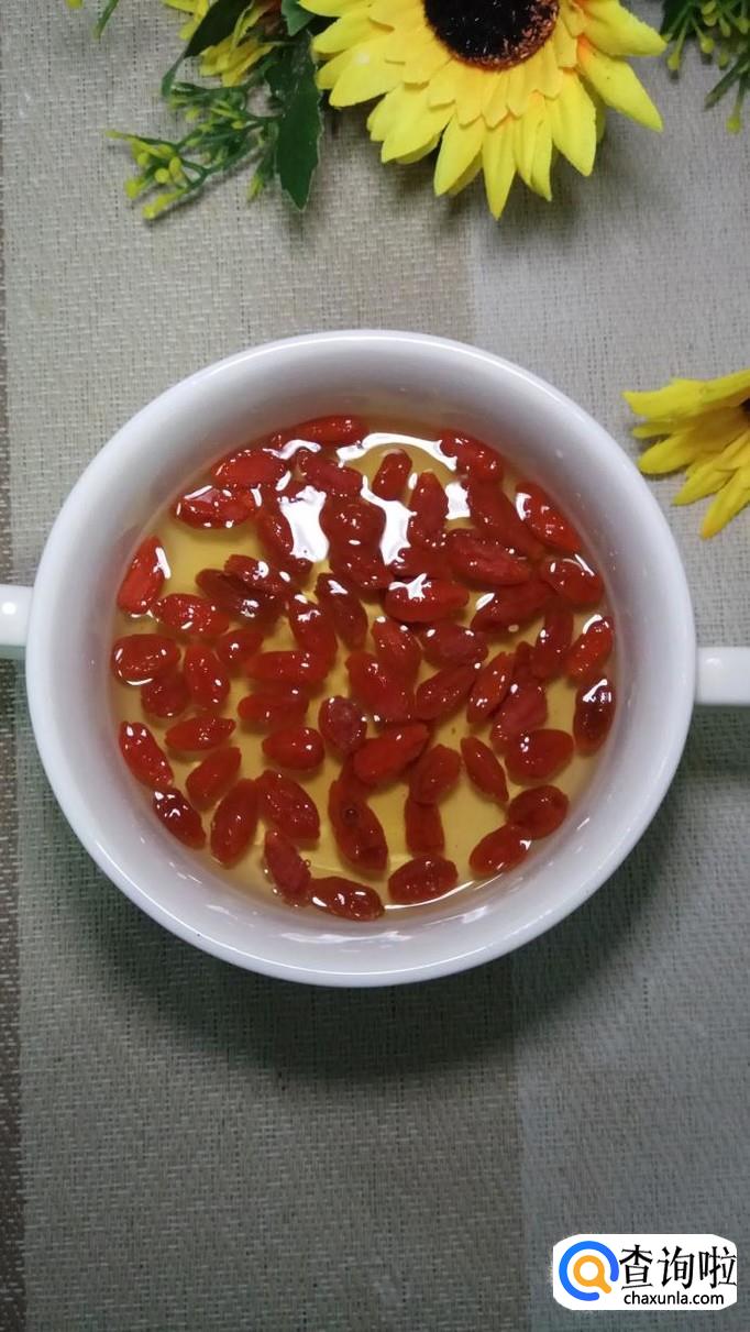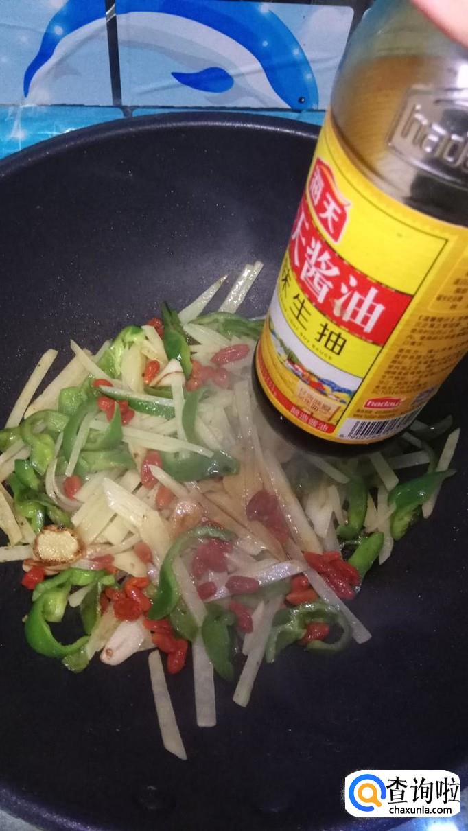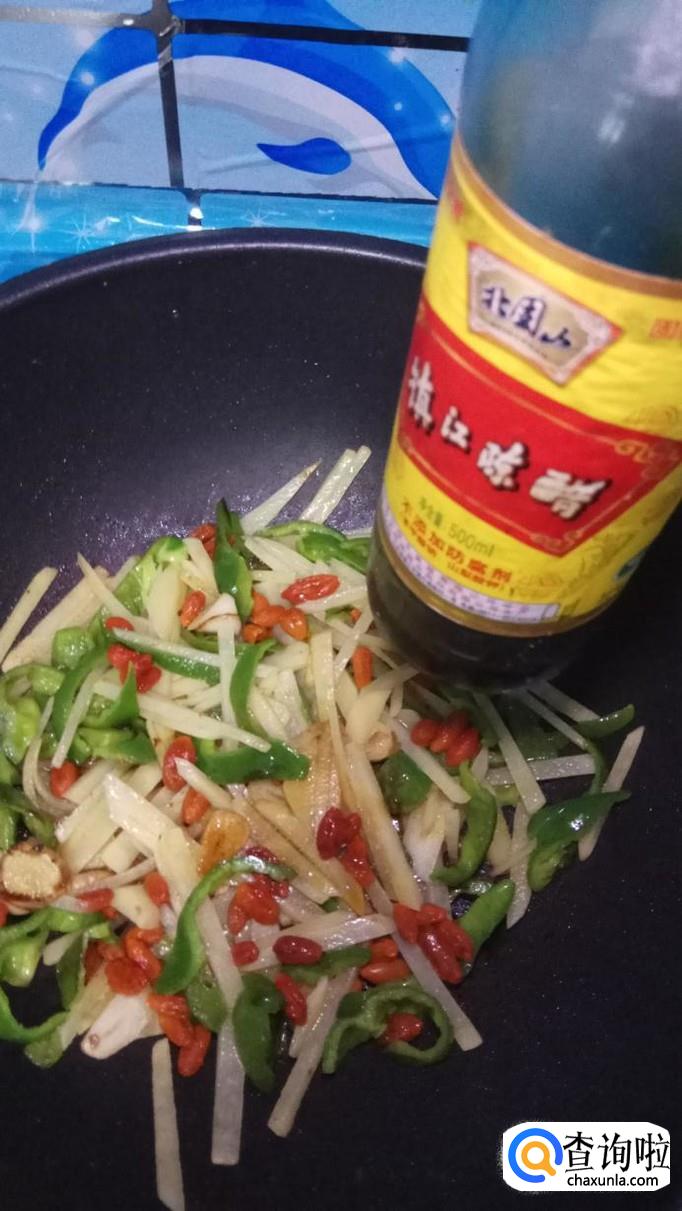 再将泡好的枸杞子倒入锅中,加入适量生抽,陈醋,搅拌均匀。