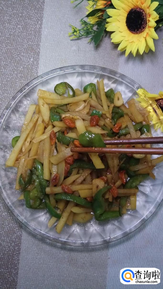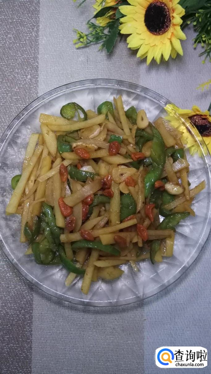 土豆适量,青椒适量,枸杞子适量,蒜适量,盐适量,五香粉适量,鸡精适量,生抽适量,香醋适量。