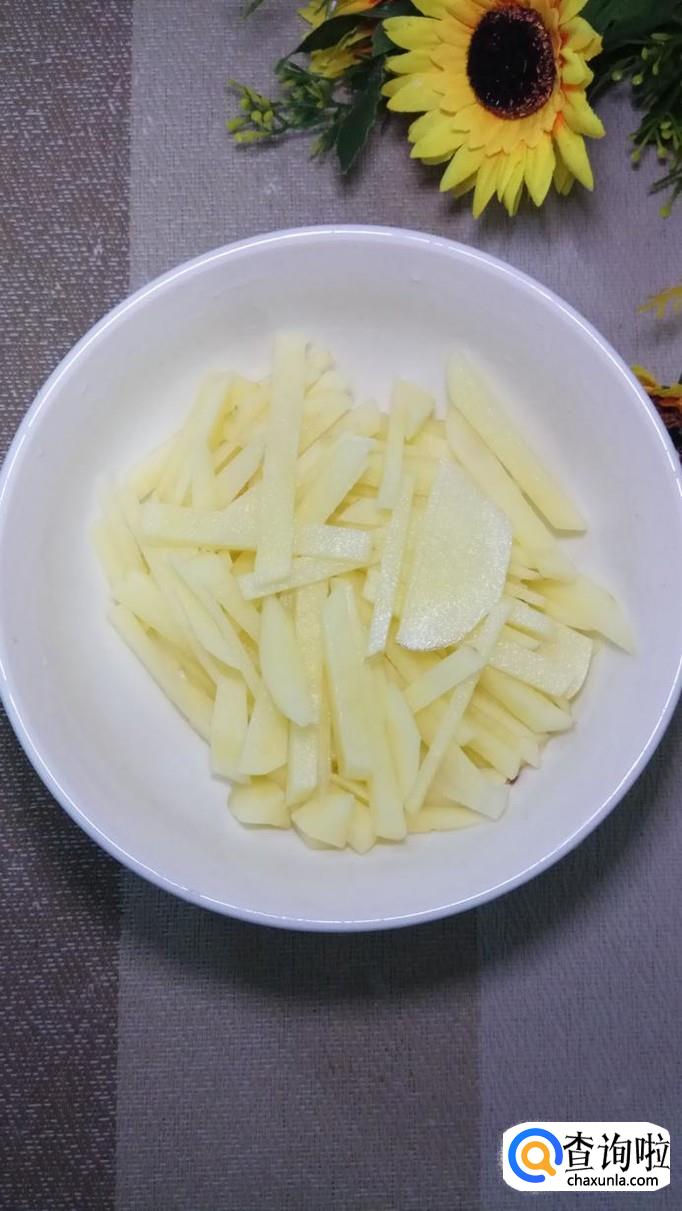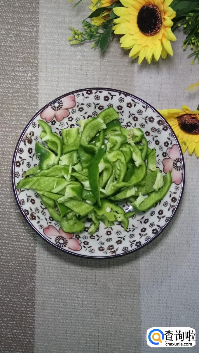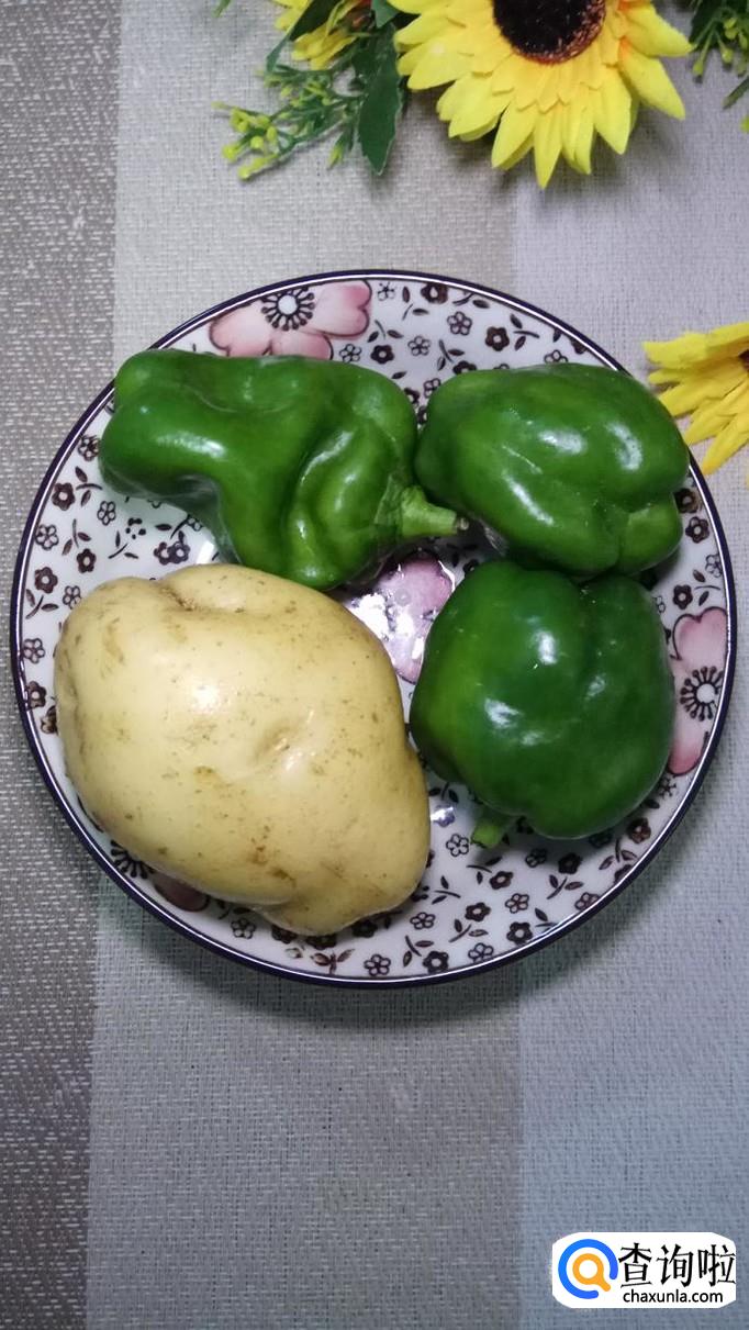 将土豆去皮后切成条,用清水洗去淀粉,再将青椒切成丝,放入盘中备用。