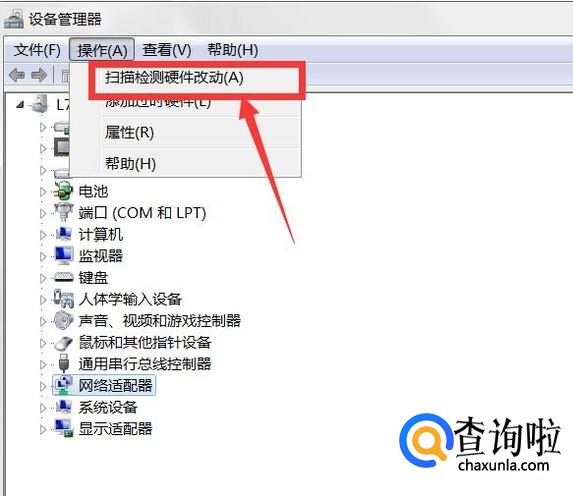 点击操作,会出现一个下拉菜单,选择“扫描检测硬件改动”。系统会自动的安装网卡驱动,安装完成以后,重启电脑就可以了。
