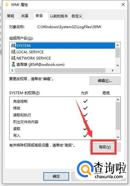 因为要进行特殊权限设置,所以直接点击面板中的“高级”按钮。