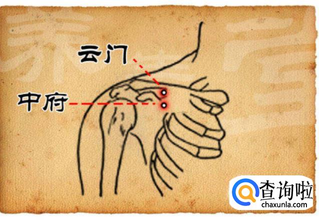 【中府】-中府在胸部,横平第2肋间隙,锁骨下窝外侧,前正中线旁开6寸。正立,双手叉腰,锁骨外侧端下方有一凹陷,该处再向下1横指即是。