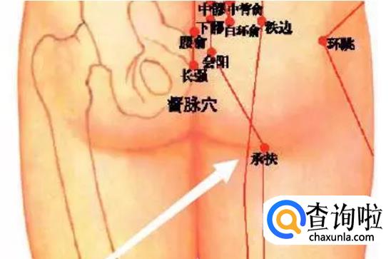 【承扶】-承扶穴位于臀部横纹线的中央下方。(大腿后面,臀下横纹的中点)。按摩承扶穴对大腿部的内侧到阴部的疼痛与僵硬、肌纤维损伤、持续长久的痔、排便或排尿困难、提高兴欲等有效果。