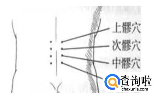 【次谬】【下谬】【上谬】-次髎穴与上髎穴相对为次也。髎,孔隙也。该穴名意指膀胱经的地部经水由此从体表流入体内。本穴物质为膀胱经上部经脉下行的地部水液,至本穴后,由本穴的地部孔隙从地之天部流入地之地部,故名。由“次谬”往上再数约三个指头宽,又有一个名为“下谬”的穴道;从“下谬”再往上算三个指头宽,还有一个“上谬”穴。