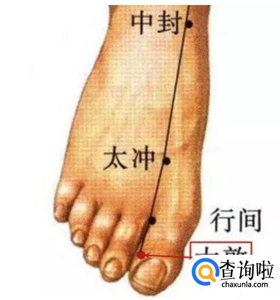 【大敦】-人体大敦穴位于足大指末节外侧,距趾甲角0.1寸。取穴时,可采用正坐或仰卧的姿势,大敦穴位于大拇趾(靠第二趾一侧)甲根边缘约二毫米处。在脚拇趾趾甲边际最靠第二趾之外有“大敦”穴。脚拇趾是一般所说“肝经”的起始处,肝经由此到生殖器、肝脏、脑、眼等依序。因此指压“大敦”的话,能是头脑清晰、眼睛明亮。指压时强压7-8秒钟,才慢慢吐气,每日就寝前重复10此左右。指压大敦有速效性。因此迟醒的早上,不妨在床上加以指压。