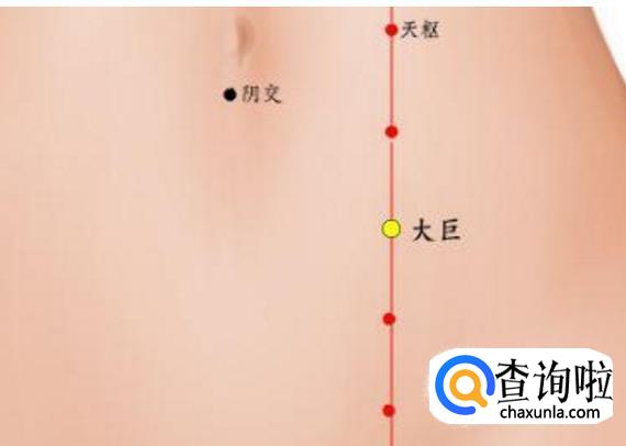 【大巨】-大巨穴在下腹部,当脐中下2寸,距前正中线2寸。 脐中下2寸,前正中线旁开2寸。共2穴(按身体对称轴对称,左右各1穴)。 大巨穴物质为外陵穴传来的地部水液,其下传之水为脾土中的外渗之水,来源及流经区域巨大,如同巨大的浅溪,故名大巨。