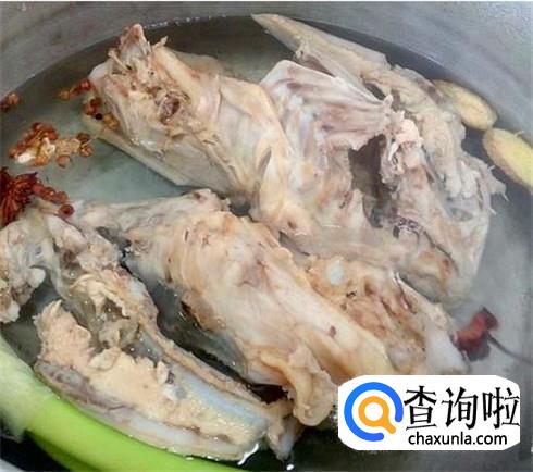 再用小火将鸡架放进锅里,放上一些料酒、生姜、大葱段,添加上清水,注意要一次性加足水分,大火烧开再用小火慢慢的熬制。