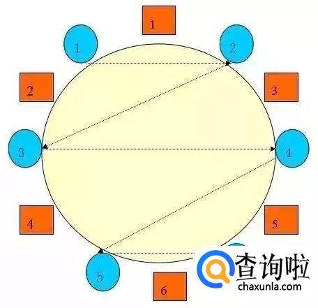 在宴席桌上和领导吃饭时,有时也可以这样排,黄色位置按编号依次坐重要领导。