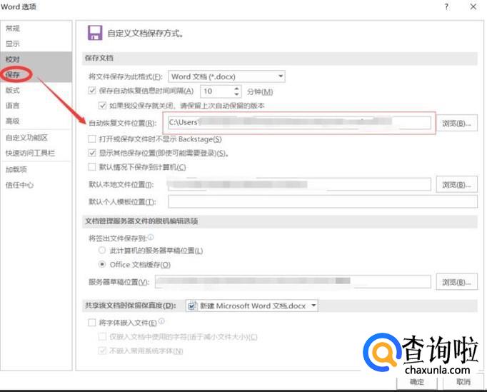 在弹出的word选项对话框中选择“保存”后,在右侧找到“自动恢复文件位置,点击”浏览“就可以看到word文档的临时文件数据,随后打开重新保存即可