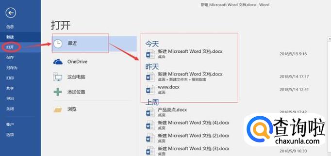 打开word,点击左上角的“文件”,找到“打开”选项点击,就可以看到最近打开文件的记录