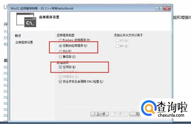 接下来在应用程序设置界面中选择控制台程序,然后选择空项目选项,如下图所示