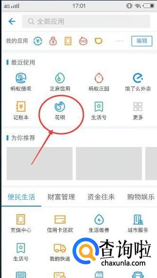 然后找到【花呗】选项,如下图所示: