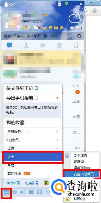 首先点击QQ左下角的“主菜单”,选择“安全”后点击“安全中心首页”。