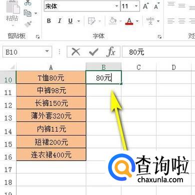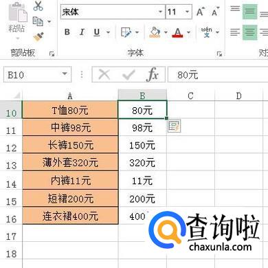 我们在B10中输入80元;然后,鼠标在其它单元格点一下,再点B10单元格,再按下CTRL+E;下面单元格即自动把其余的价格提取出来。