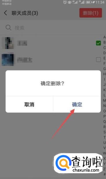弹出的界面,点击删除就可以了。需要注意的是我们是群主才可以踢人。