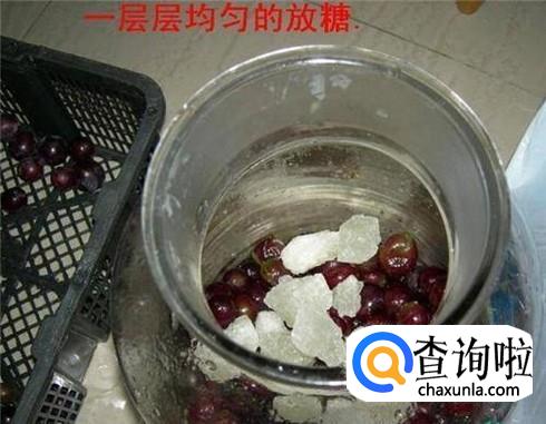 玻璃罐、冰糖、葡萄都准备好了,就开始来酿葡萄酒。先在玻璃罐铺一层葡萄,然后再撒一层冰糖。再继续铺一层葡萄,这样反复着一层葡萄一层冰糖。