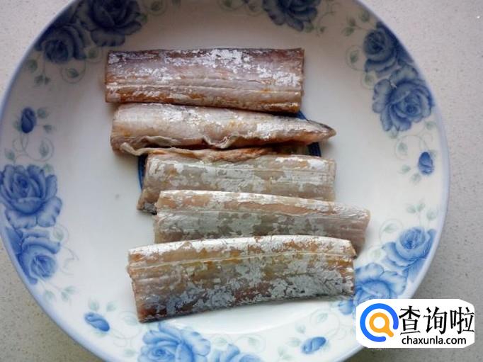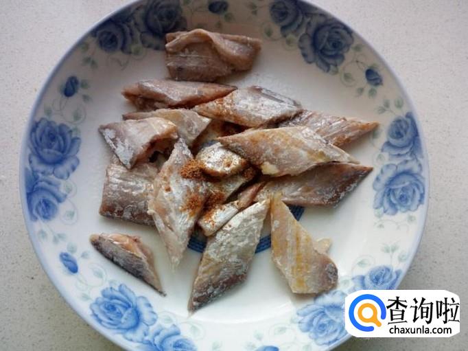 带鱼收拾清洗干净,控干水分,切成菱形段。放入少许盐,五香粉,料酒,腌制15分钟。