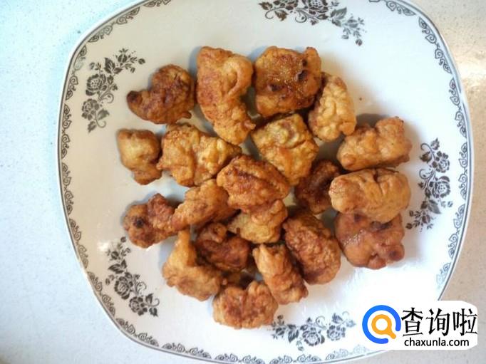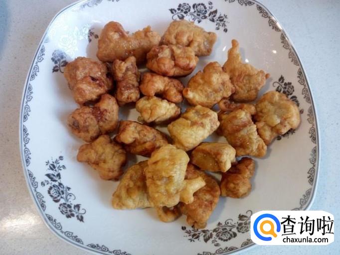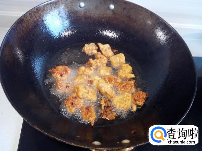 再把炸好的肉段放入锅中炸一遍(这样可以使肉段酥脆),稍炸一下即捞出,装盘备用。