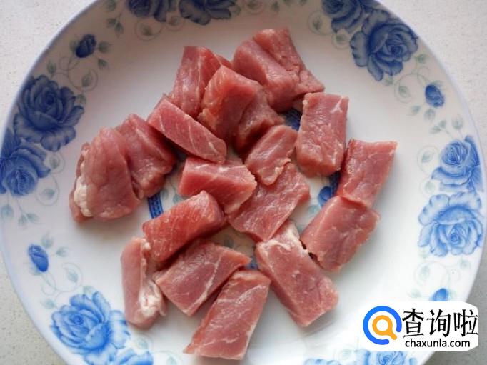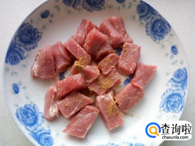 里脊肉用水冲洗一下,控干水分,切成4公分左右长,2公分左右宽的段。放入少许盐,五香粉,料酒,腌制15分钟。