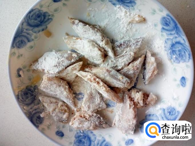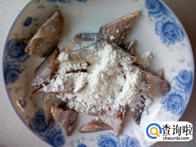 把腌制好的带鱼段,放入一匙儿淀粉,用手抓匀挂糊。