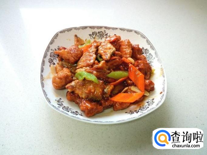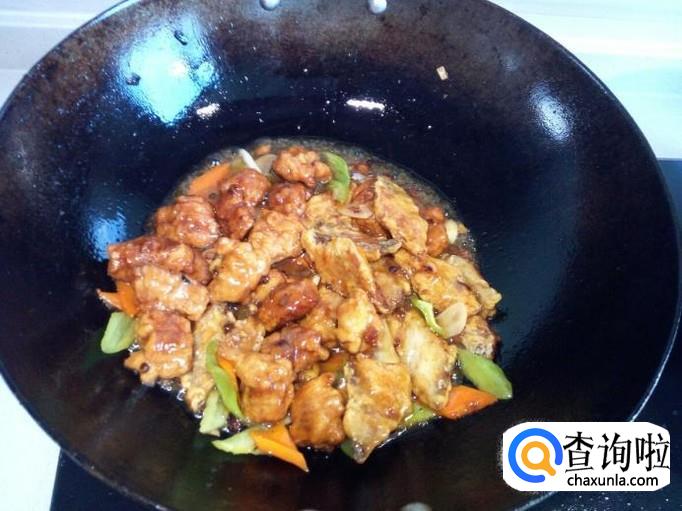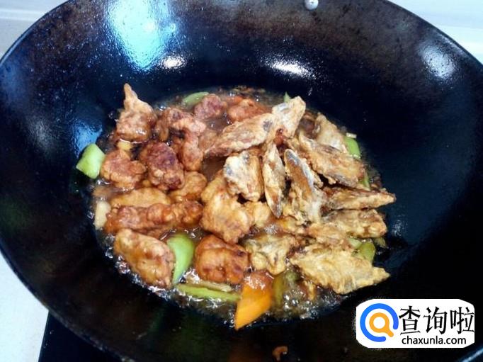芡汁粘稠后,把炸好的肉段,鱼段,一起放入锅中,颠勺翻两下个即可,关火出勺。