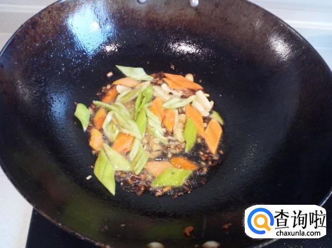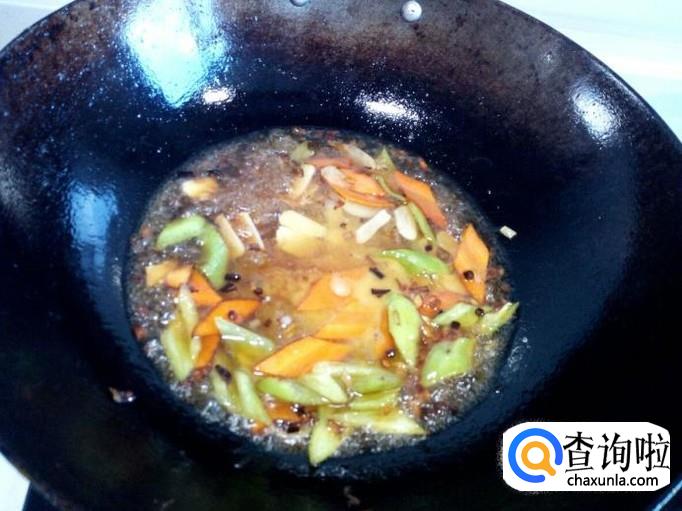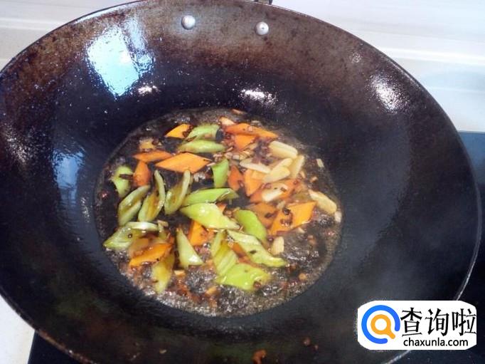 盛出多余的油,锅内留少许油加热,油热后放入花椒,葱,姜,蒜,爆锅,放入胡萝卜,青尖椒略翻炒一下。