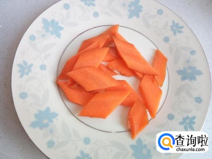 青尖椒用水清洗干净,控干水分,切成菱形片。胡萝卜去皮用水清洗干净,切成菱形片。切好葱,姜,蒜,备用。