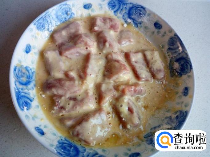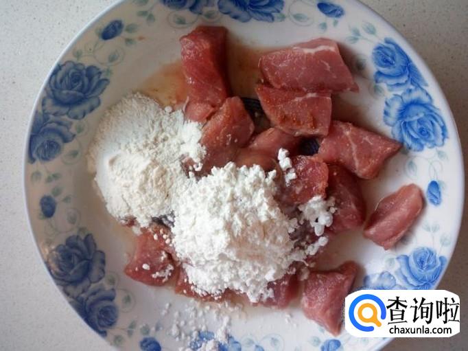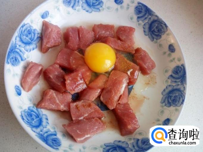 把腌制好的肉段放入一个鸡蛋,一匙儿面粉,两匙儿淀粉,用手抓匀挂糊。