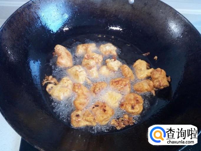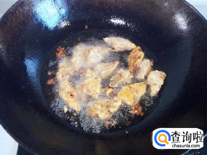 锅内放入多一些的油加热,油热后放入肉段油炸,炸至外表焦黄,盛出备用。