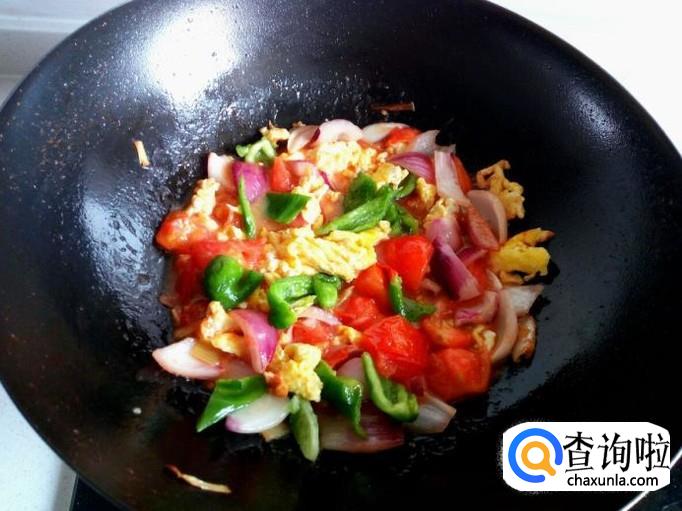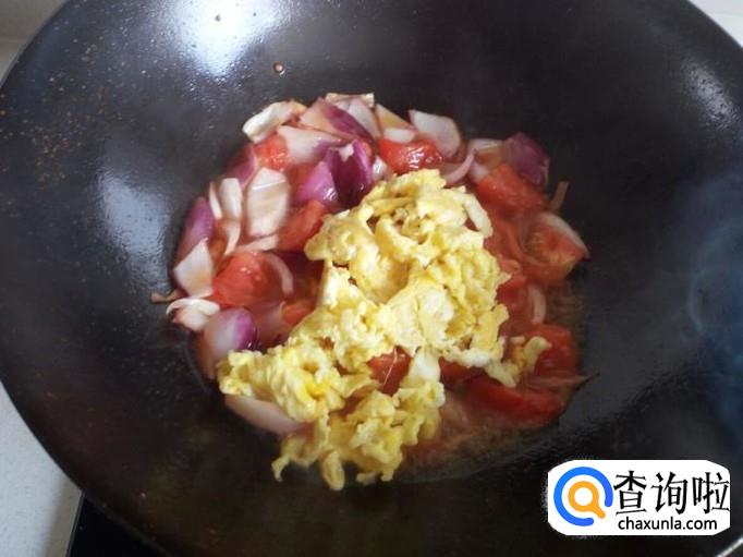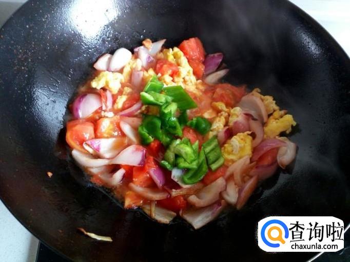 炒至圆葱断生,放入炒好的鸡蛋,略翻炒一下,放入青椒。