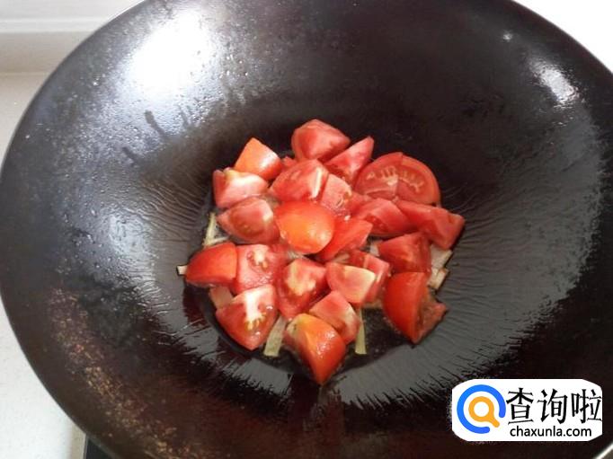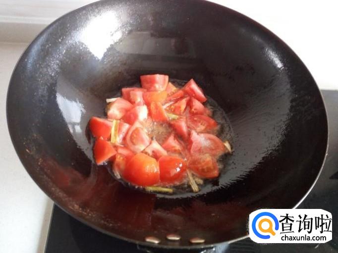 锅内放入油加热,油热后放入葱,姜,爆锅。放入西红柿翻炒。