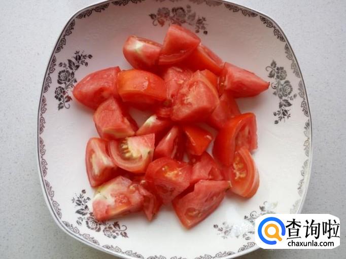 西红柿用水清洗干净,控干水分,切成块。