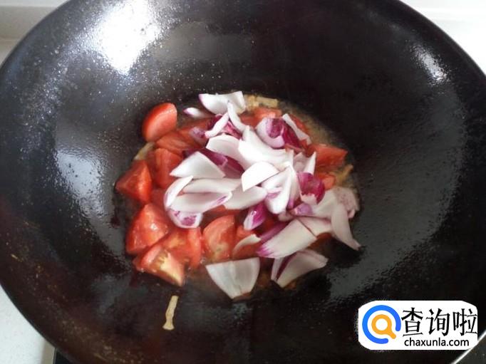 炒至西红柿变软,放入圆葱,放入少许料酒,五香粉,盐,快速翻炒。