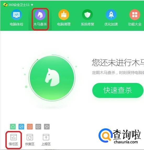 在“木马查杀”的界面,我们看到左下角有一个“信任区”按钮,点击一下。